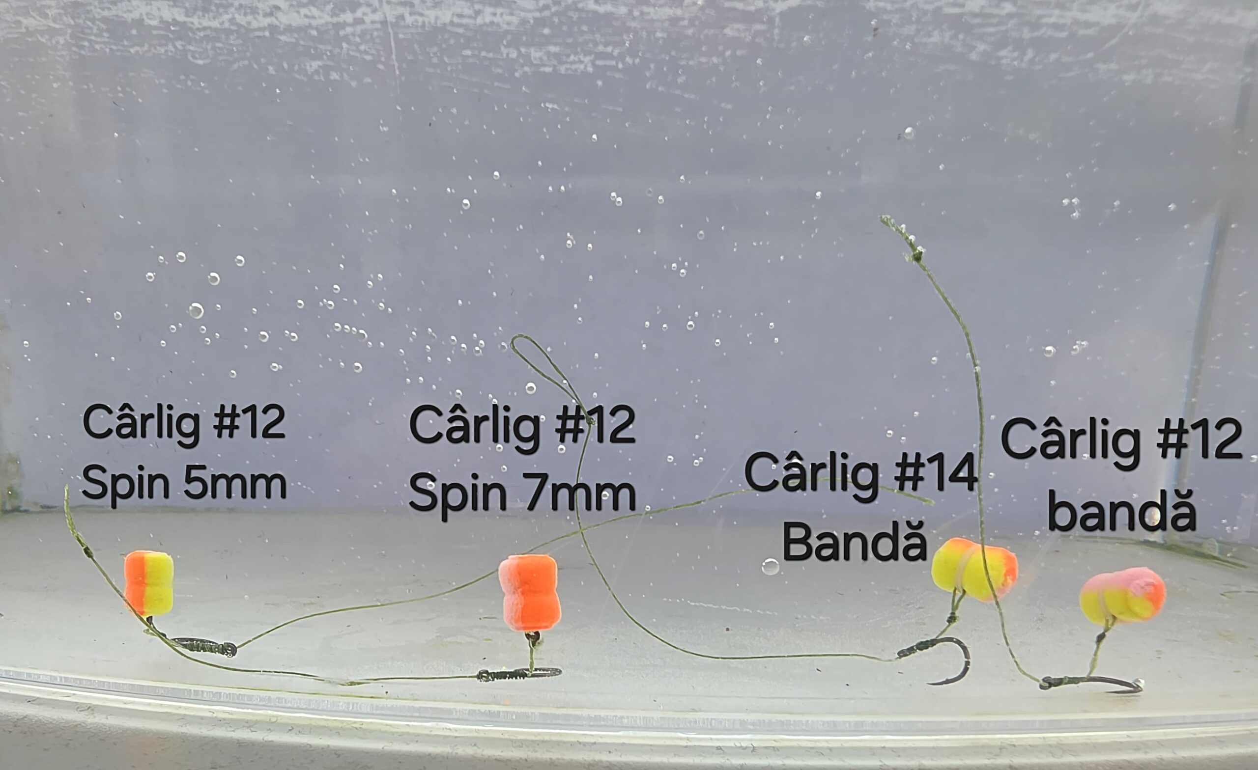 Ca si arome, am combinat gustul dulce al ananasului si al bananei si l-am asezonat cu putin acid n-butyric, care a dat rezultate foarte bune, in special in perioada calda. Se echilibreaza perfect cu carlige marimea 12 si 14, atat pe banda cat si pe spin de 5 mm si 7 mm. Se pot folosi cu aproape orice carlig, dar nu mai mic de marimea 14 si in functie de cum doriti sa se prezinte montura.